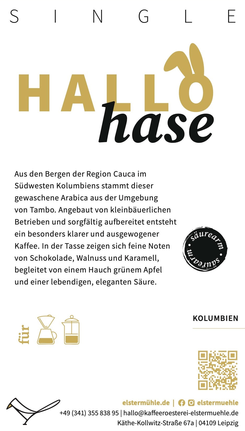 Aus den Bergen der Region Cauca im Südwesten Kolumbiens stammt dieser gewaschene Arabica aus der Umgebung von Tambo. Angebaut von kleinbäuerlichen Betrieben und sorgfältig aufbereitet entsteht ein besonders klarer und ausgewogener Kaffee. In der Tasse zeigen sich feine Noten von Schokolade, Walnuss und Karamell, begleitet von einem Hauch grünem Apfel und einer lebendigen, eleganten Säure.