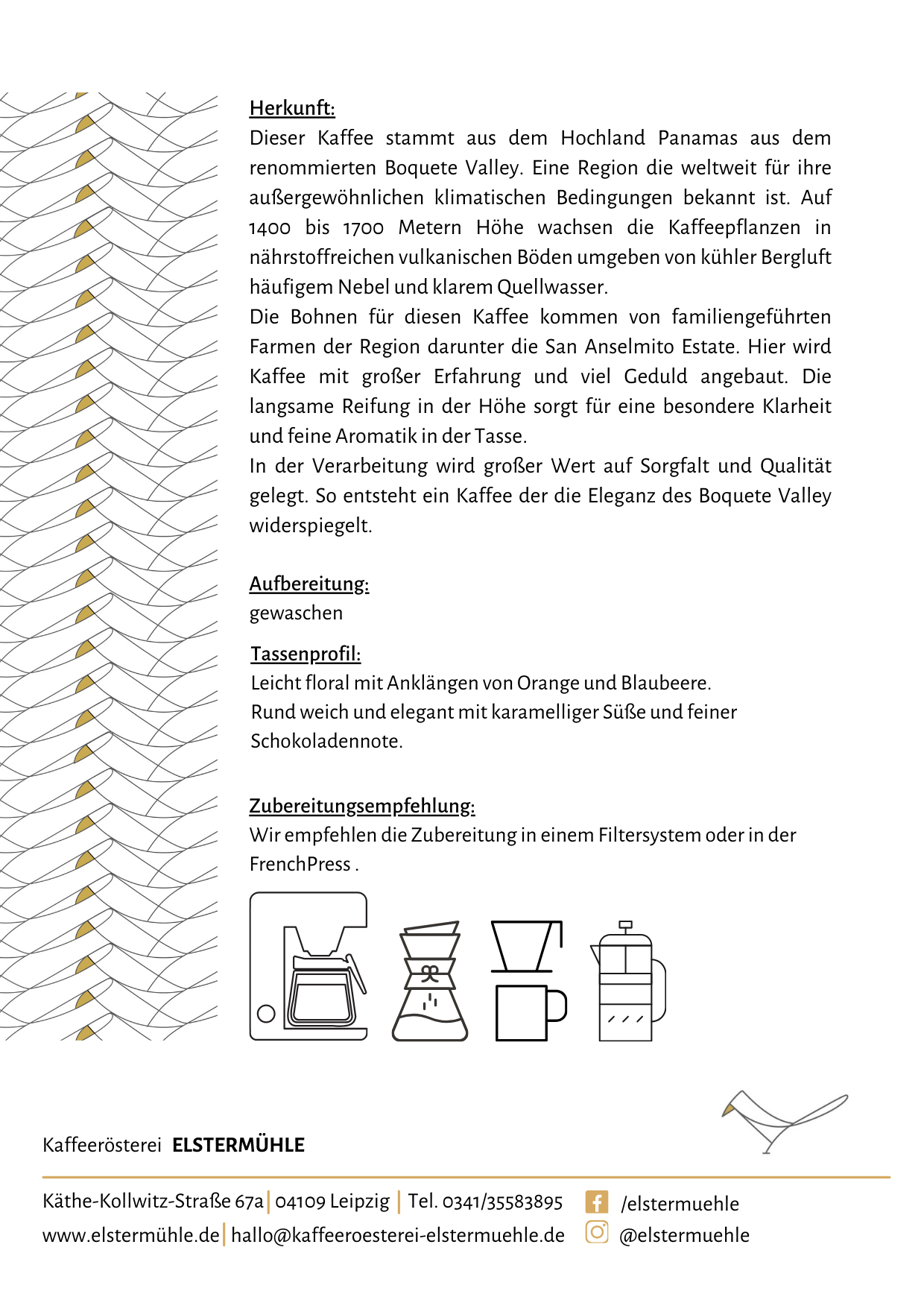Dieser Kaffee stammt aus dem Hochland Panamas aus dem renommierten Boquete Valley. Eine Region die weltweit für ihre außergewöhnlichen klimatischen Bedingungen bekannt ist. Auf 1400 bis 1700 Metern Höhe wachsen die Kaffeepflanzen in nährstoffreichen vulkanischen Böden umgeben von kühler Bergluft häufigem Nebel und klarem Quellwasser.