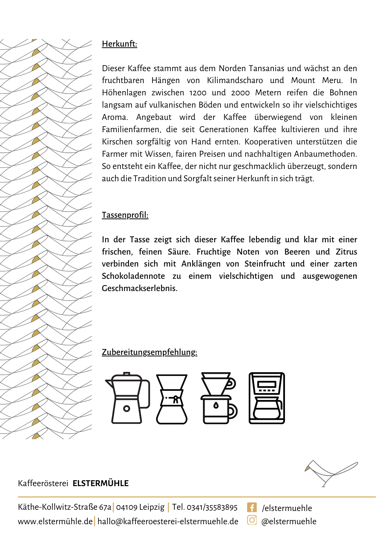 Dieser Kaffee stammt aus dem Norden Tansanias und wächst an den fruchtbaren Hängen von Kilimandscharo und Mount Meru. In Höhenlagen zwischen 1200 und 2000 Metern reifen die Bohnen langsam auf vulkanischen Böden und entwickeln so ihr vielschichtiges Aroma. Angebaut wird der Kaffee überwiegend von kleinen Familienfarmen, die seit Generationen Kaffee kultivieren und ihre Kirschen sorgfältig von Hand ernten. Kooperativen unterstützen die Farmer mit Wissen, fairen Preisen und nachhaltigen Anbaumethoden.